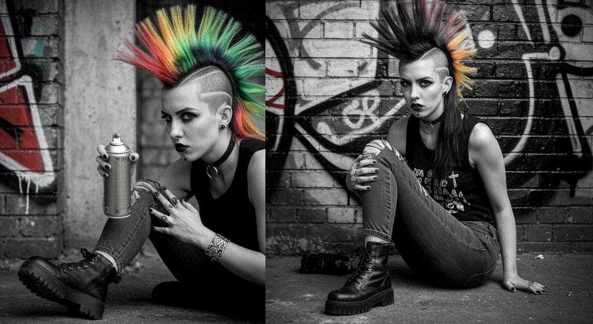 A striking image of a punk girl with a mohawk, skinny jeans, and combat boots, holding a spray can. The photo features a high-contrast portrait reminiscent of Kodak Portra film with graffiti background.