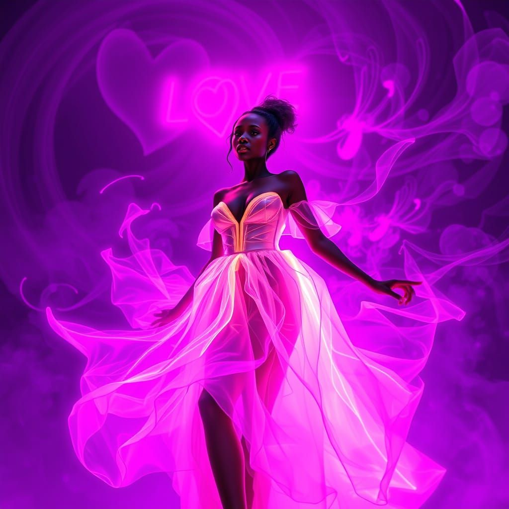 This image shows a Black woman in a neon dress amidst swirling purple and pink colors. The artwork evokes love and adoration in a futuristic, cyberpunk aesthetic.