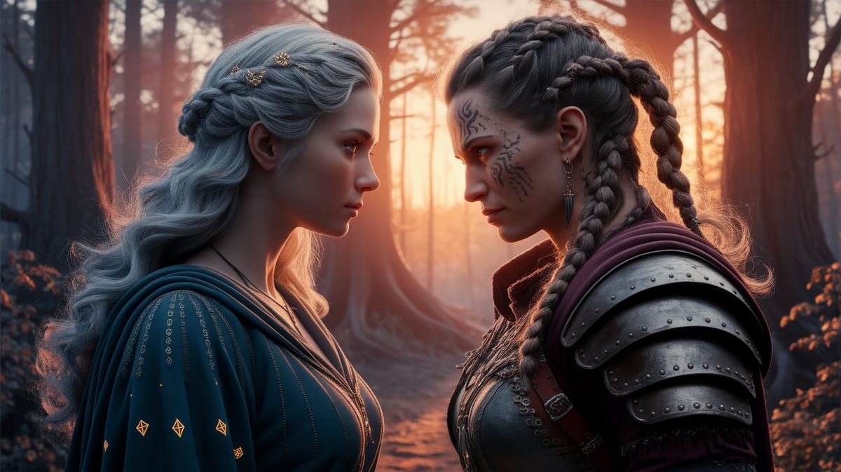 A striking close-up photograph shows a beautiful witch and a savage warrior in a sun-dappled ancient forest. The image features intricate details and sharp focus, highlighting their contrasting attire and intense expressions.