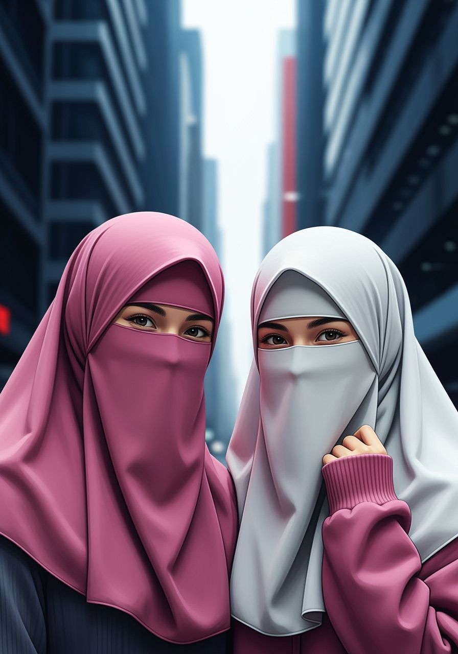 This image shows two beautiful Irish women wearing niqabs, smiling against a bright, modern cityscape. The portrait evokes a fantasy art style with deep colors and intricate details, reminiscent of Unreal Engine 5 graphics.