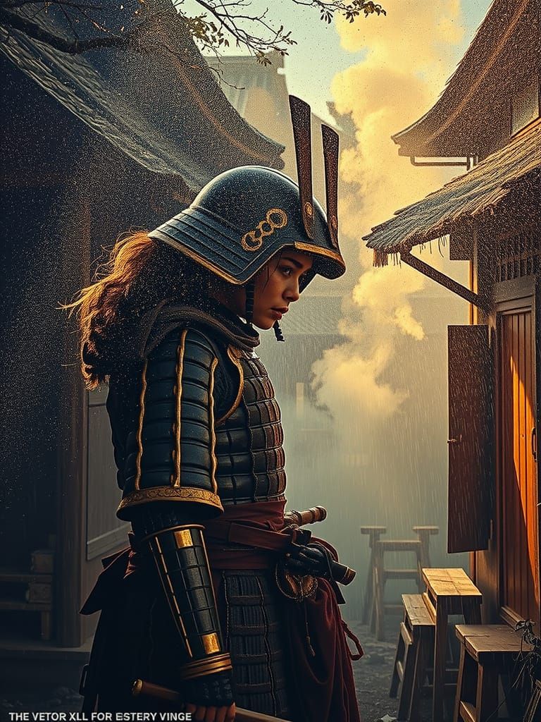 A powerful samurai woman warrior in detailed armor stands in a dusty village. Cinematic lighting and film grain create an epic, atmospheric scene.