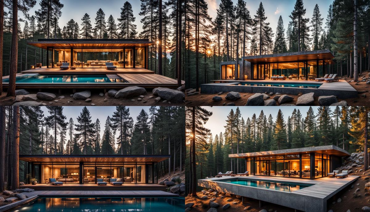 This image shows a modern cabin at sunset. The minimalist design features glass, wood, and a concrete roof with a sun deck. A turquoise pool and stone walls add to the tranquil forest setting.