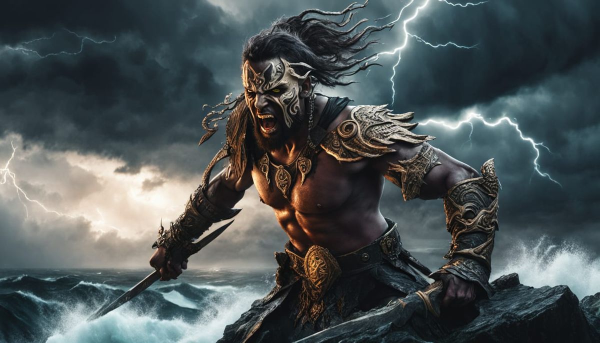 A close-up of a Pictish Warrior in face paint, standing atop a clifftop with a raging ocean below, illuminated by lightning and shrouded in ominous clouds.