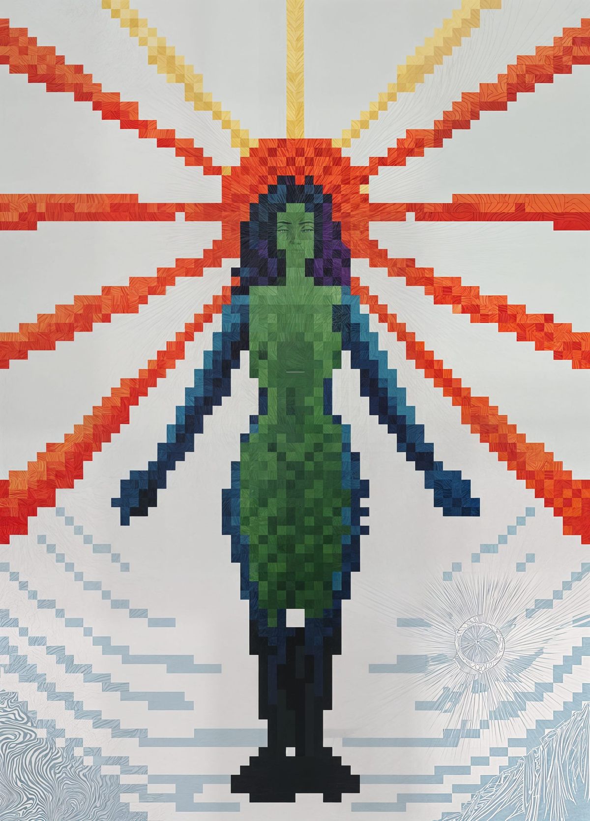 This image features a dreamlike woman surrounded by abstract woodcut patterns, basking in radiant sunshine with kaleidoscopic colors reminiscent of psychedelic poster art and surrealist flair.