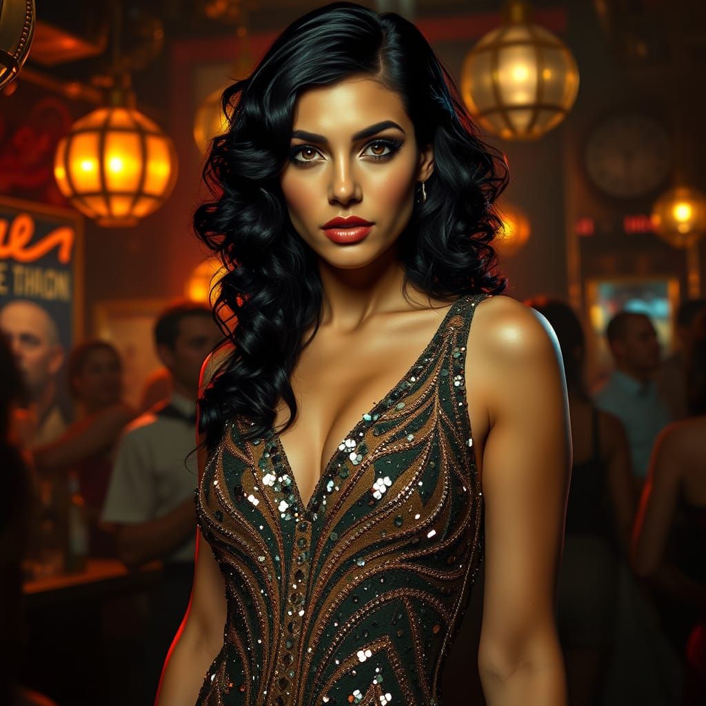 This image shows a glamorous flapper in a dazzling, sequin dress, set against the vibrant backdrop of a 1920s speakeasy, evoking the opulent style of Gustav Klimt and Tamara de Lempicka