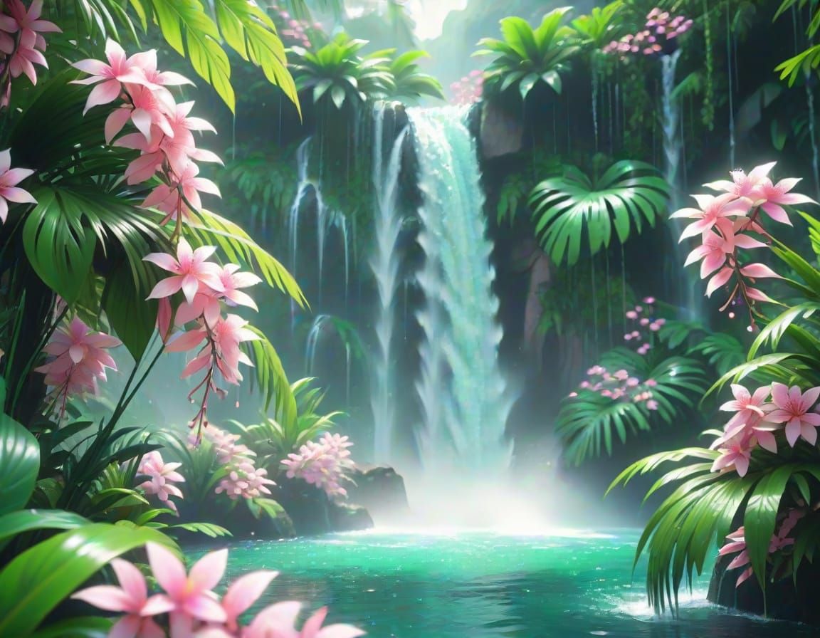 This image shows a vibrant anime-style scene featuring lush tropical plants and delicate pink flowers encircling a waterfall. The macro photography captures shimmering water droplets and a soft mist in a pastel color palette.