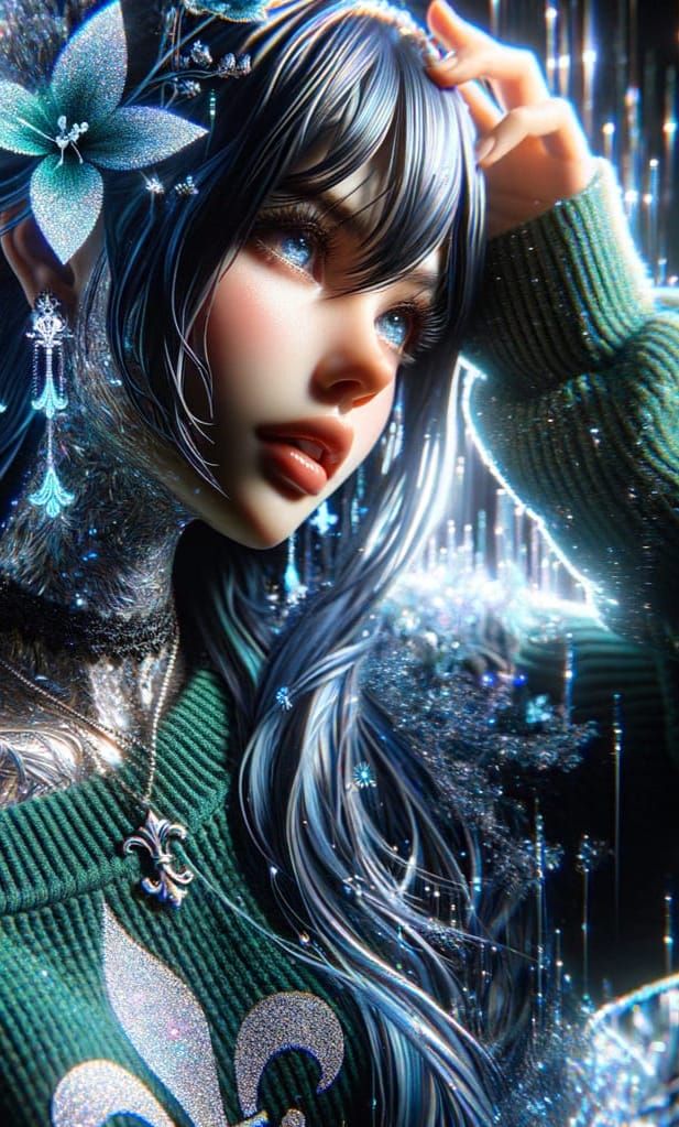 This hyperrealistic image features an emo-style Hispanic girl in a green sweater, with Fleur de Lis flowers overlaying her. The double exposure effect creates depth with metallic reflections and a splashing water detail.