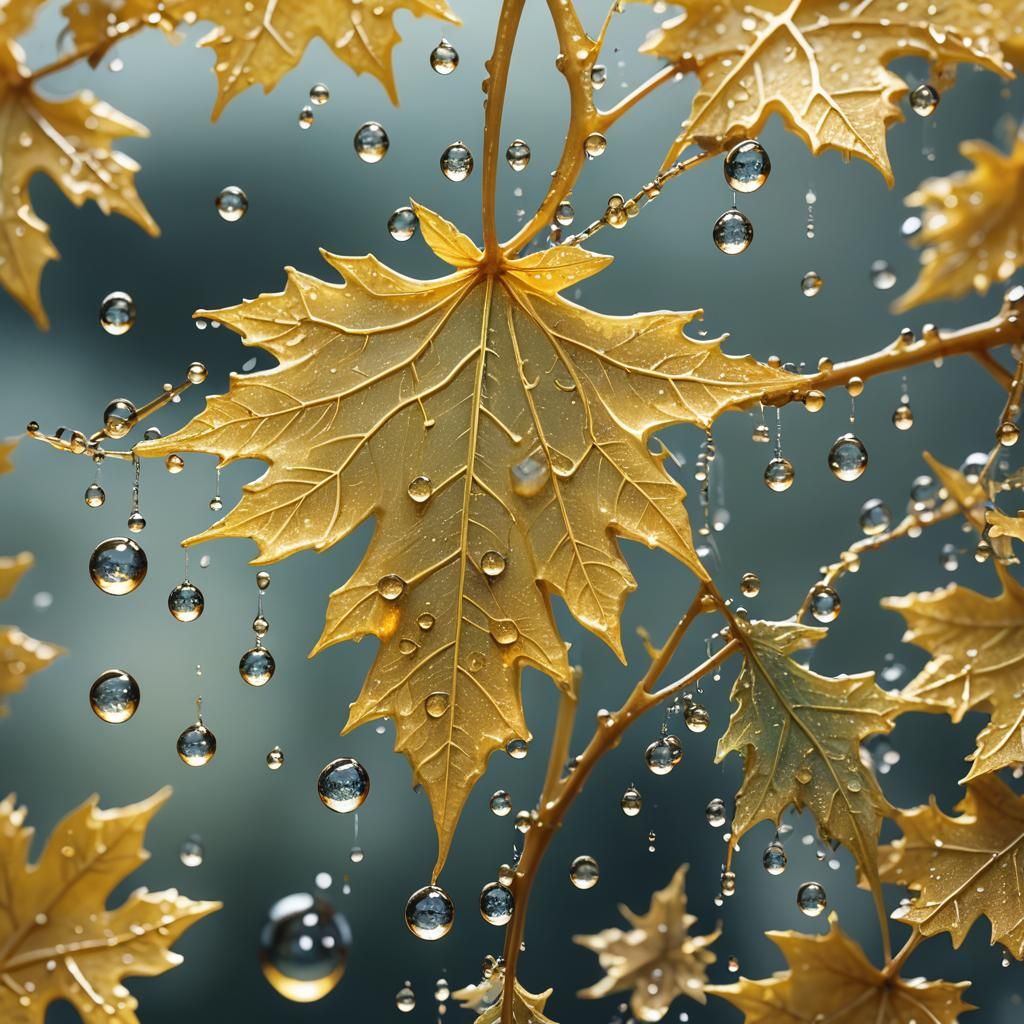 This image shows a close-up of a maple leaf with dewdrops shaped like musical notes. The macro photograph features soft lighting and pastel colors, rendered as 3D anime art.