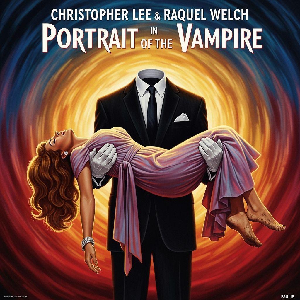 This image shows a faded, monochromatic movie poster featuring an empty suit carrying an unconscious Raquel Welch. The poster is highly detailed with vibrant colors, in a hyperrealistic style reminiscent of lomography.
