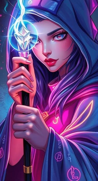 A digital painting featuring a sorceress in mystical robes holding a wand. The artwork showcases vibrant lines, neon hues, and shimmering fabrics with a whimsical, fantasy illustration style.