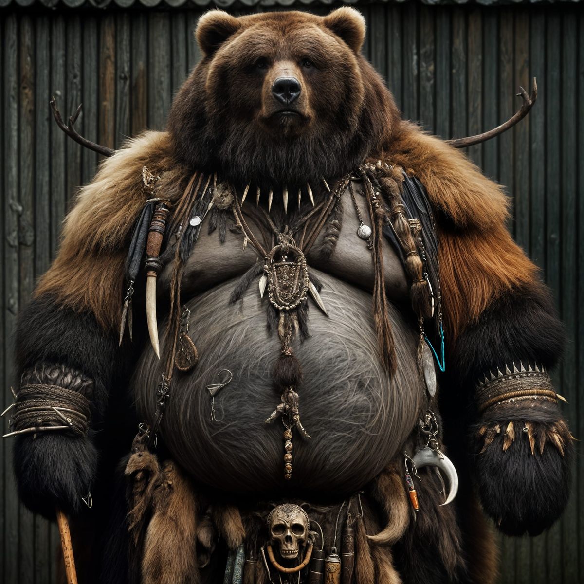 A full-body photograph of an obese Kodiak bear dressed as a tribal shaman. The bear-necromancer has piercings and is adorned with tribal fur.