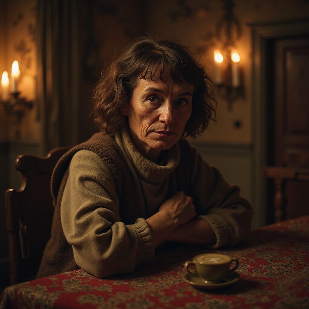 A realistic portrait of an elderly female villager inside a cozy, candlelit inn. The image evokes old master paintings through its use of realistic textures, dramatic lighting, and a subdued color palette.