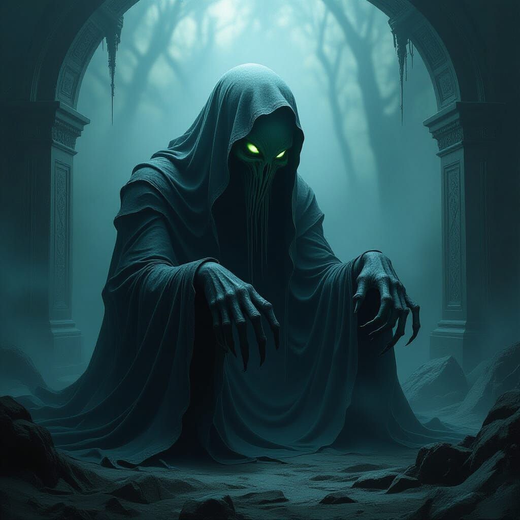 This image shows a tentacled, otherworldly creature in eerie darkness. The scene, reminiscent of surrealist and biomechanical art, presents a haunting atmosphere of worship.