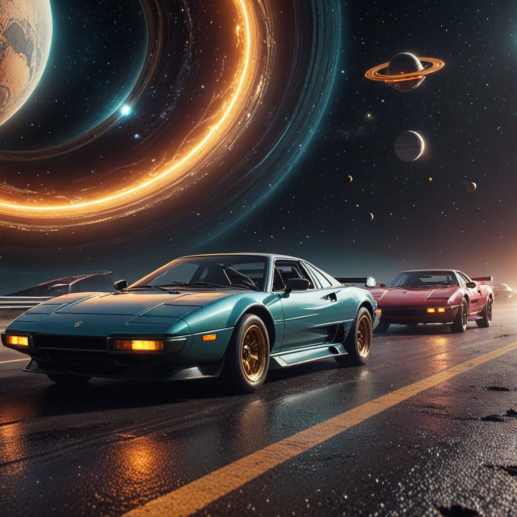 This image shows vintage sports cars engaged in a race across the rings of Saturn, set against a backdrop of deep space. The digital artwork features neon lighting, vibrant colors, and golden hour illumination.