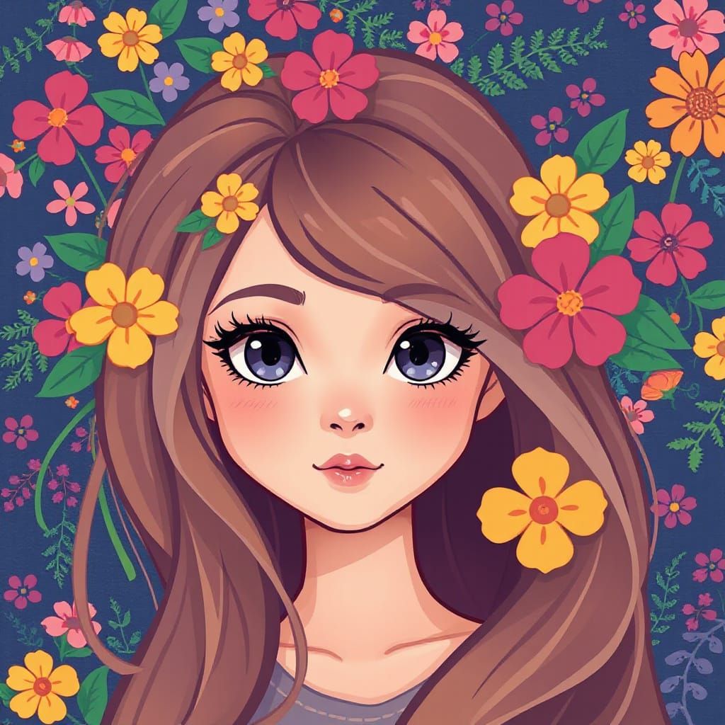 A vibrant 2D cartoon portrait of a young woman with flowing hair. Her face is framed by colorful flowers and whimsical patterns in a classic Disney animation style.