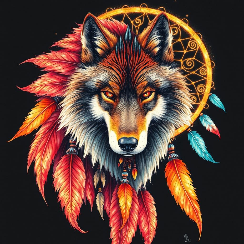 Vibrant watercolor pencil illustration of a majestic Native American Dreamcatcher embodied as a powerful wolf, adorned with fiery, swirling patterns and feathers, set against a rich, velvety black background. Mit feurigen farben, the Dreamcatcher's web glows with an ethereal, golden light, as if infused ...