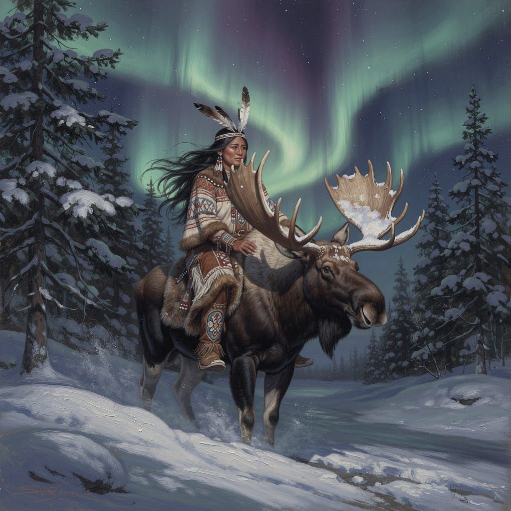 This image shows an Indigenous woman riding a moose in a snowy forest under the aurora borealis. Rendered as a detailed oil painting, it captures nature's beauty and a spiritual connection.