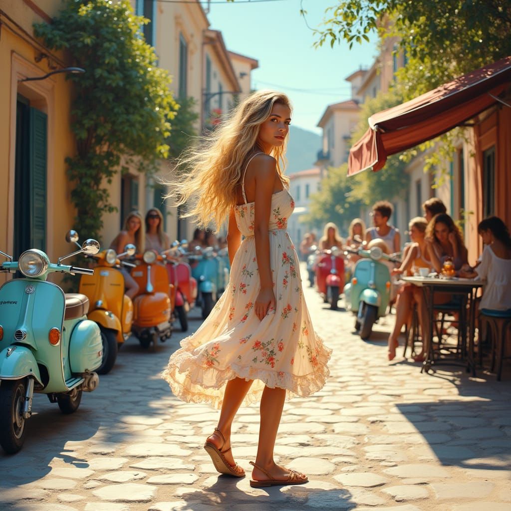 A serene seaside scene of a young woman standing on a cobblestone street, surrounded by vintage Vespas and scooters, with friends gathering at a cafe in the background, bathed in warm Mediterranean light