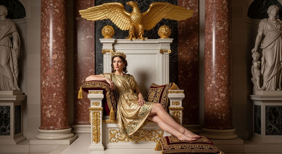 A photograph of Empress Messalina seated on an ornate throne. The throne room is lavishly decorated with marble columns and statues, captured in ultra-high resolution with natural lighting.