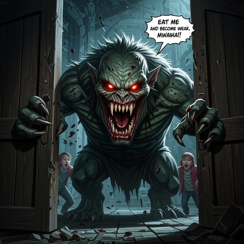 A terrifying monster with glowing eyes smashes through doors, laughing maniacally at panicked children. This digital matte painting features dramatic lighting and an epic scale, evoking dark fantasy concept art.