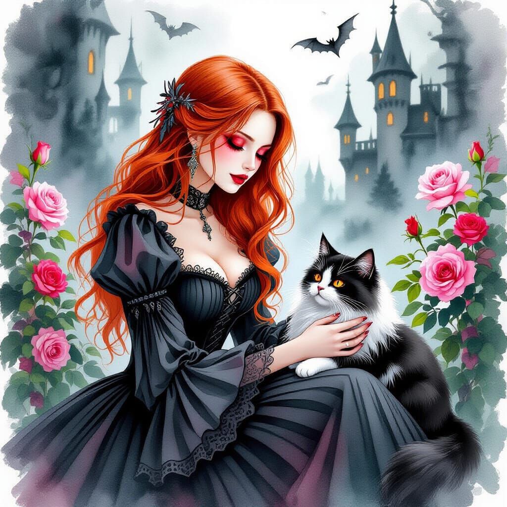 This image shows a red-haired woman in a gothic dress petting a fluffy cat near a rose bush in a creepy castle. The artwork is in an alcohol ink style.