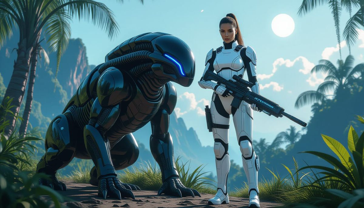 A woman in a futuristic jumpsuit stands in an alien jungle next to a four-legged creature. The scene is rendered with a photorealistic style and cinematic composition, in a science fiction aesthetic.