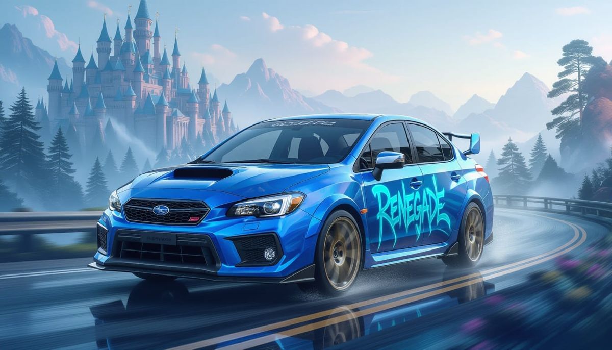This image features a 2022 Subaru WRX STI in a galaxy-blue wrap and gold wheels, with neon 'RENEGADE' graffiti on the windshield. It drives through a misty, ethereal fantasy landscape with soft, magical lighting.