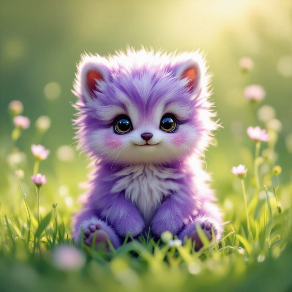 This image shows a cute, fluffy animal with purple fur sitting in a meadow. The artwork features photorealistic textures, a soft bokeh effect, and subtle highlights against a blurred background. The aesthetic resembles detailed wildlife paintings.