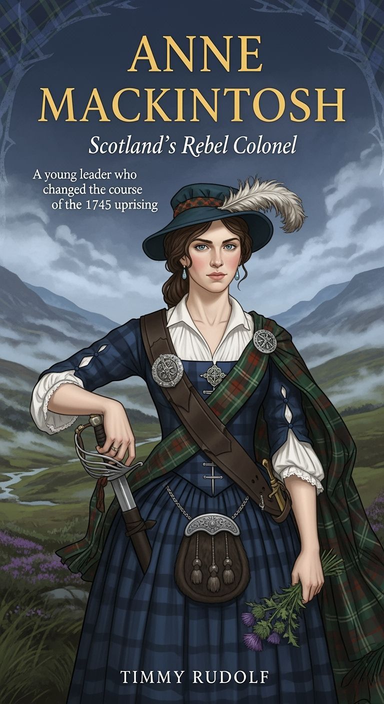 An inspiring historical illustration of Anne Mackintosh in 18th-century Highland attire, confidently posed with a sword. Set against a dramatic, misty Scottish landscape with cinematic lighting.