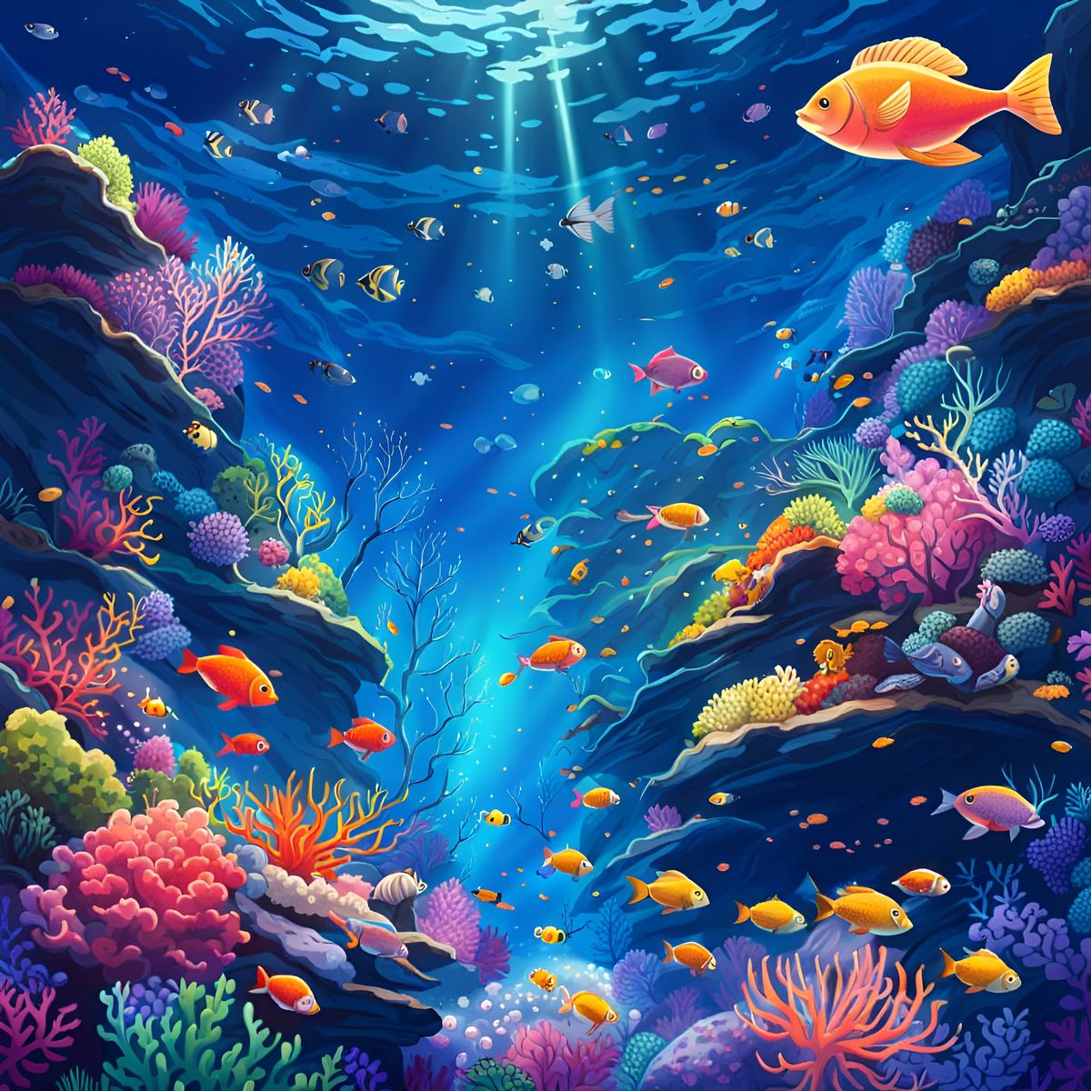 A vibrant cartoon-style image of an underwater scene teeming with fish and coral. Diffuse light illuminates the colorful marine life in this anime-inspired vista.