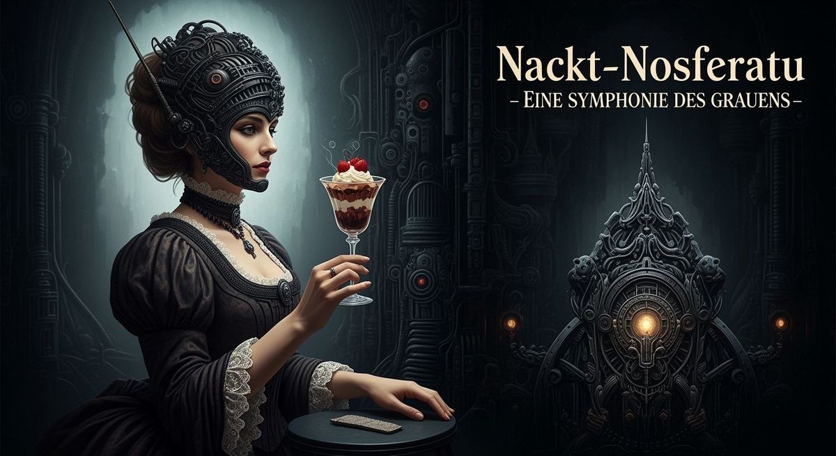 This striking album cover features a Victorian woman holding dessert against a dark, eerie backdrop. The artwork blends biomechanical and gothic horror elements with intricate, industrial details.