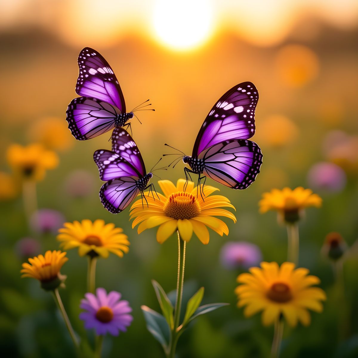 This image shows a dreamy meadow with yellow daisies and purple wildflowers, bathed in golden sunlight. Two violet butterflies flutter above, with a soft bokeh effect creating an enchanting, fantasy-like scene.