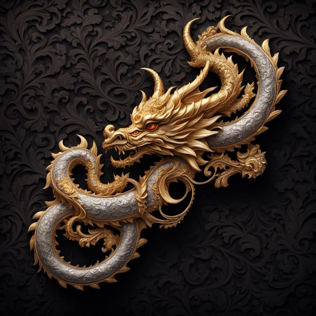 This image shows a beautifully crafted, Baroque-inspired dragon hair clip with intricate engravings of noble imagery, set against a dark velvet background with luxurious metallic highlights and delicate, swirling patterns of gold and silver.
