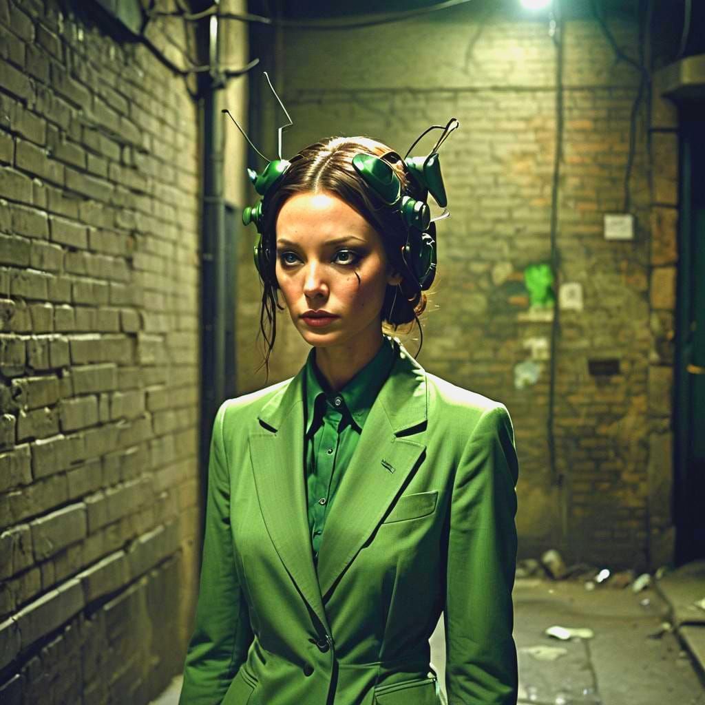 This image shows a mantis-like girl with antennae, clad in a green suit. The cinematic shot features film grain, vignette, and dramatic, atmospheric lighting.