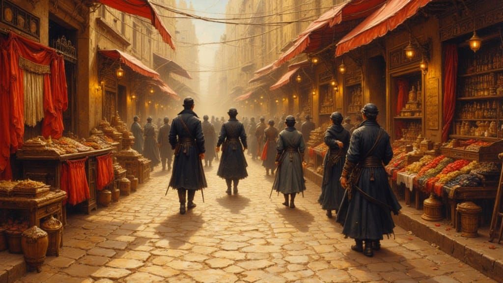 This image shows an assassin walking through an Egyptian alleyway filled with people selling silks and spices. The oil painting uses textured paint and heavy brushstrokes in an impressionistic style, reminiscent of mid-1880s art.