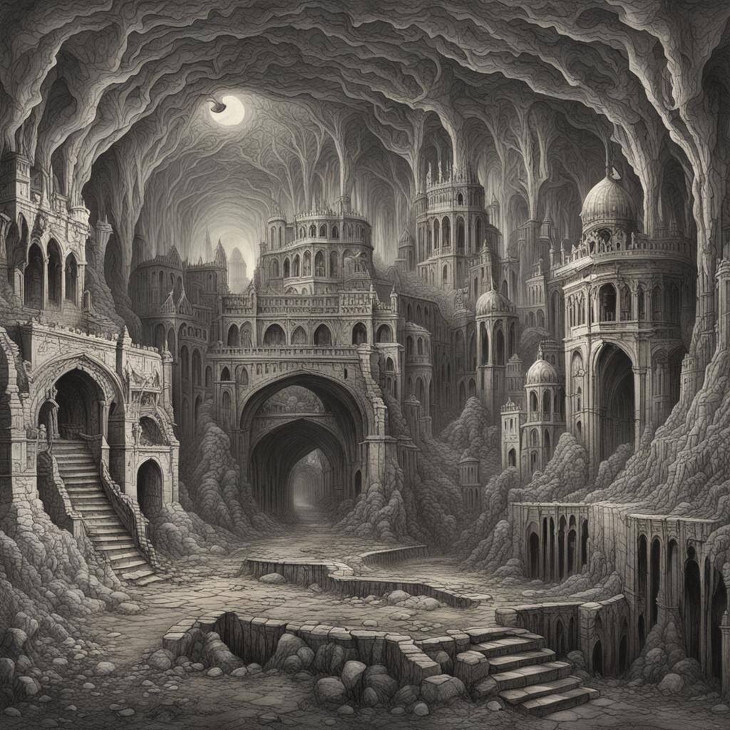 This image depicts a deep and mysterious fantasy world underground. The surreal landscape invites viewers to explore the unknown depths of this subterranean realm.