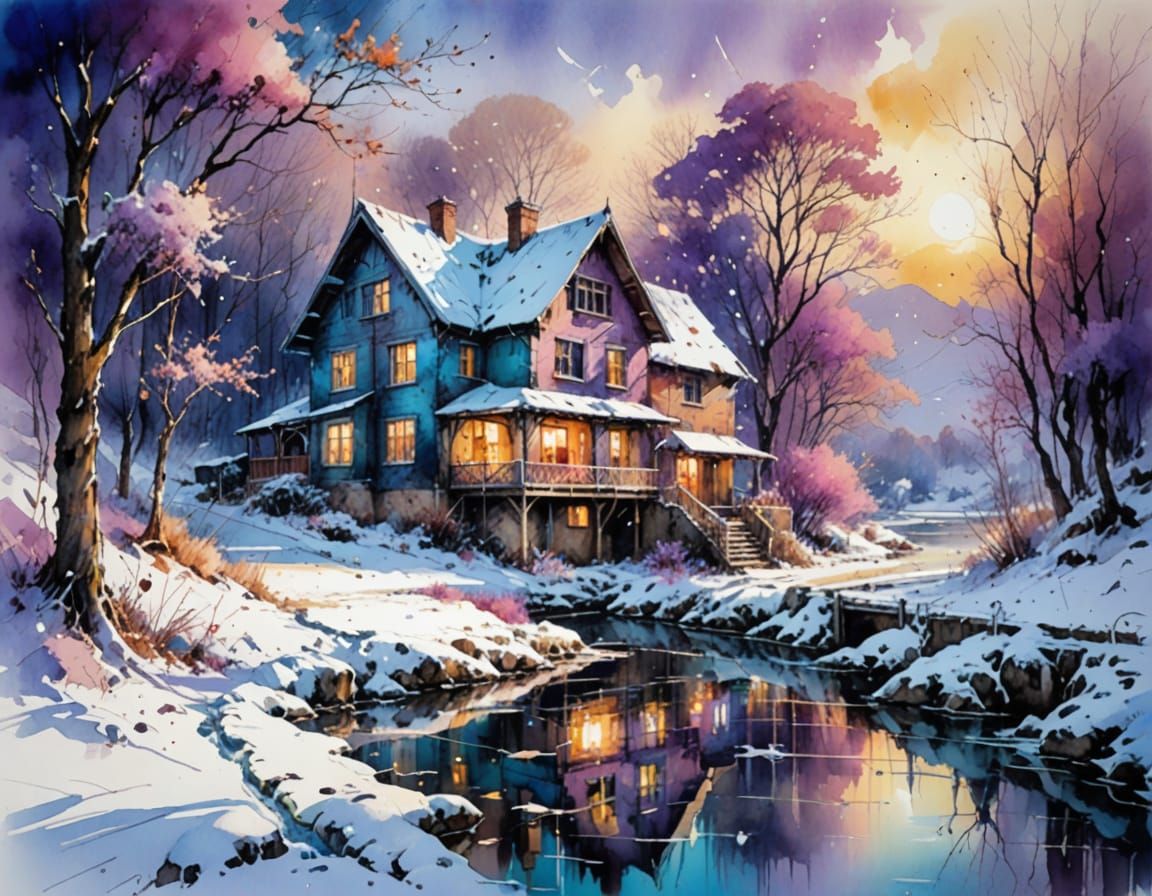 Easily generate your own winter river house images with our free AI image generator, perfect for artistic and colorful scenes