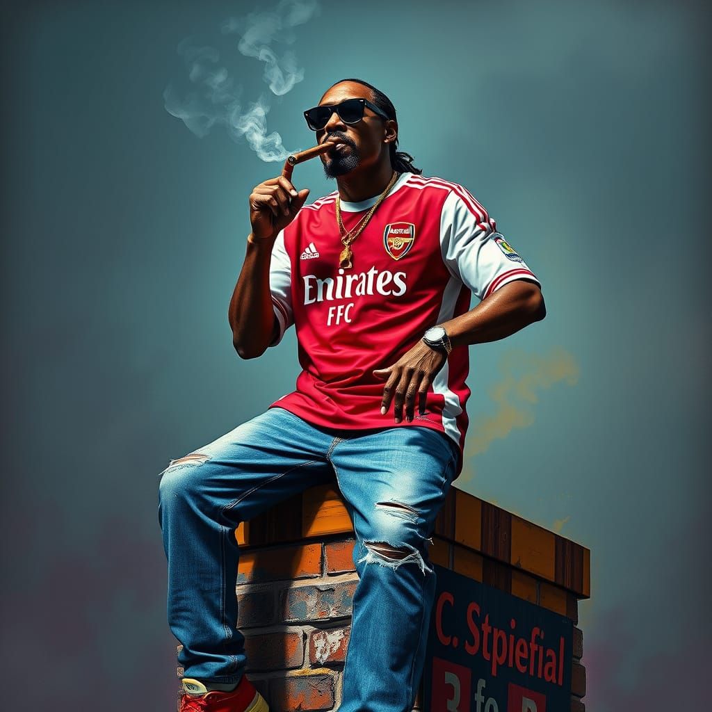 This image shows Snoop Dogg in an Arsenal jersey, smoking a cigar atop a chimney. The artwork features expressive brushstrokes, a gritty high-contrast realism and a cyberpunk aesthetic.