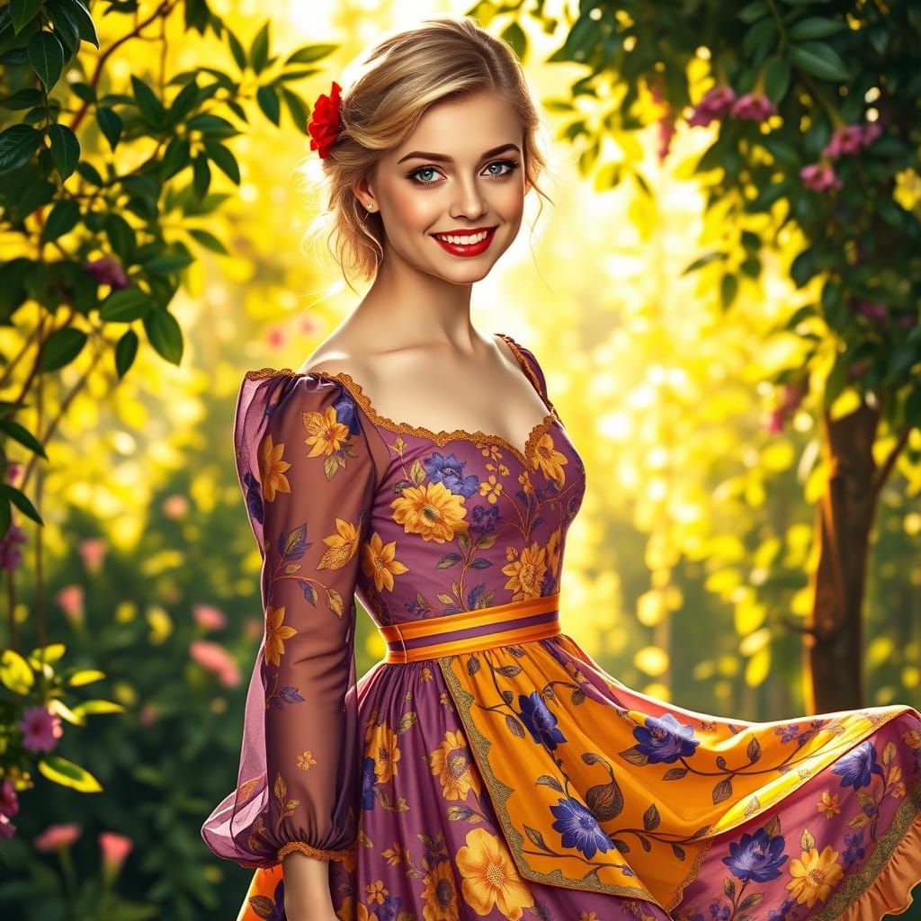 This image depicts a young woman in a vibrant floral dress, surrounded by lush greenery and warm sunlight, in a style reminiscent of Art Nouveau and Pre-Raphaelite paintings, with intricate details and flowing lines