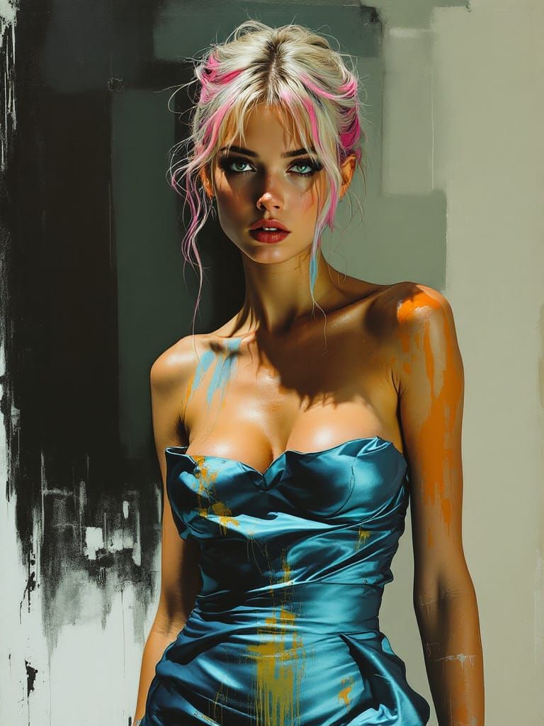This image features a full-body portrait of a pin-up style woman with pink-tipped blonde hair, wearing a short metallic cyan satin dress. The art style combines bold chromatic restraint and unsettling psychological tension with clinical brutality.