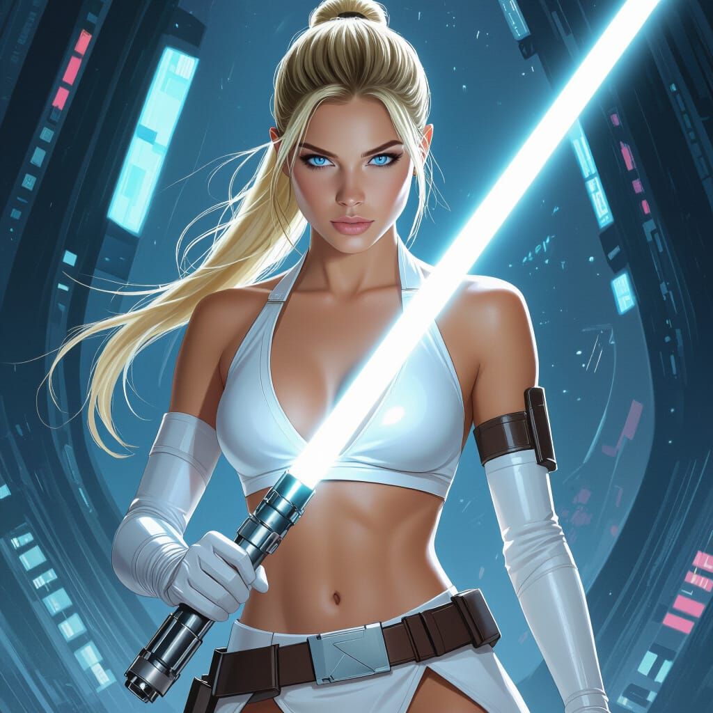 A striking picture of a female Jedi warrior in futuristic armor. She wields a white lightsaber, her blonde hair and blue eyes adding to her fierce determination in a futuristic aesthetic.