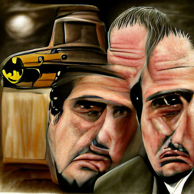 A digital painting of a tabby cat dressed as Don Corleone. The cat is wearing a dark suit and seated in a leather chair, in a classic movie poster style.