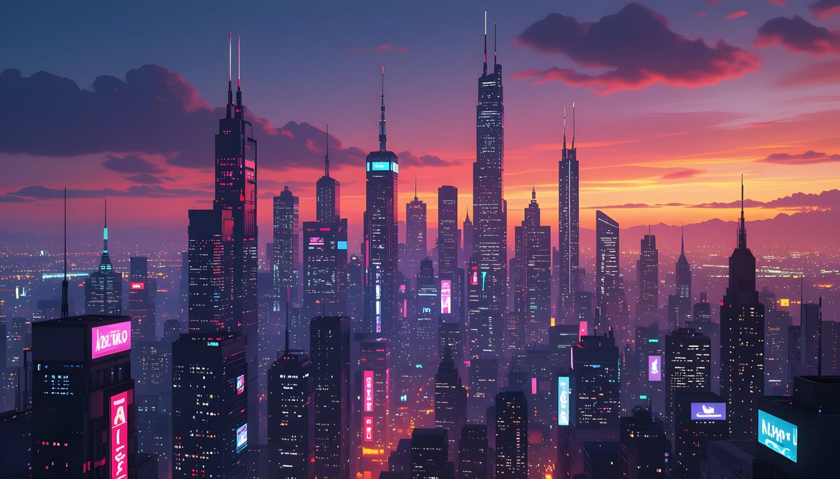 A vibrant cityscape at dusk featuring towering structures and advanced technology. The image is rendered in a digital painting style with rich colors and intricate details, reminiscent of science fiction concept art.