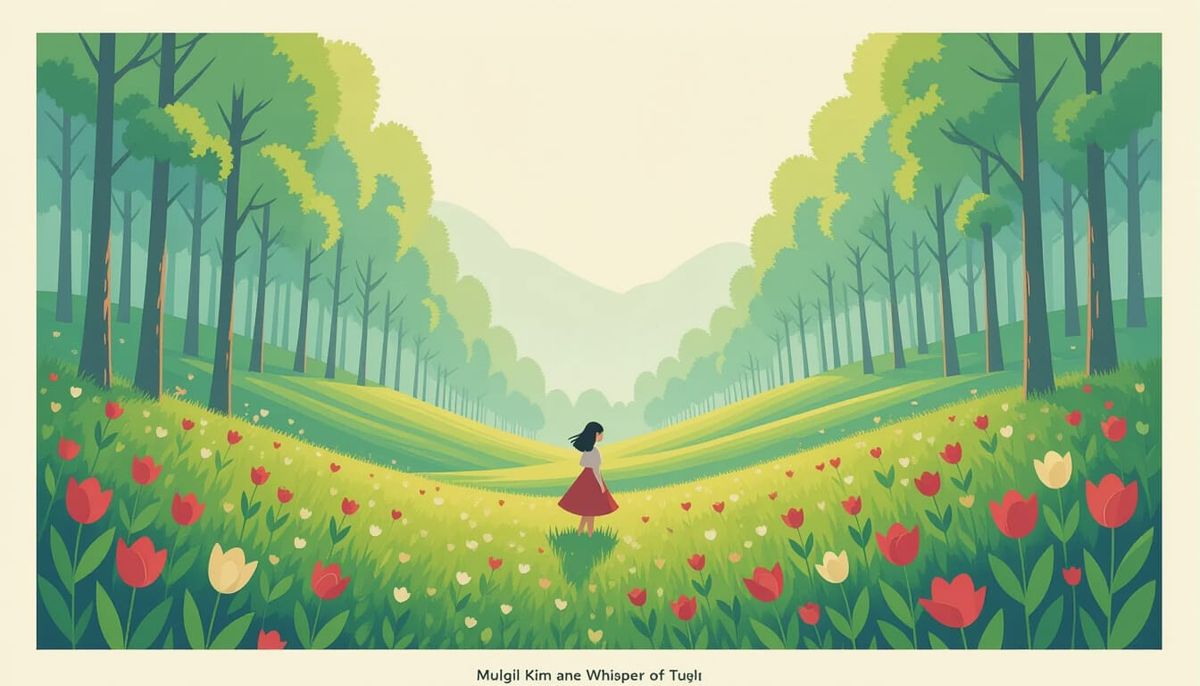 A surreal landscape painting featuring rippling forests and vibrant flora. This dreamlike image, rendered in an ethereal style with intricate patterns, captures a whimsical scene with vibrant colors and gentle light.