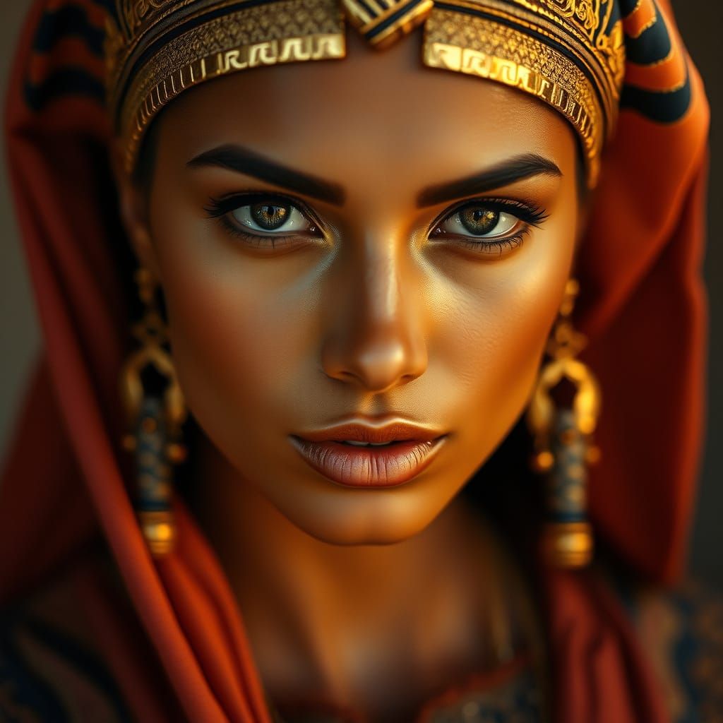 This captivating portrait showcases a woman with classic Egyptian features, adorned in traditional regalia, and bathed in warm, cinematic lighting, reminiscent of iconic works from the past, with a photorealistic quality that invites the viewer to step into a world of timeless beauty.
