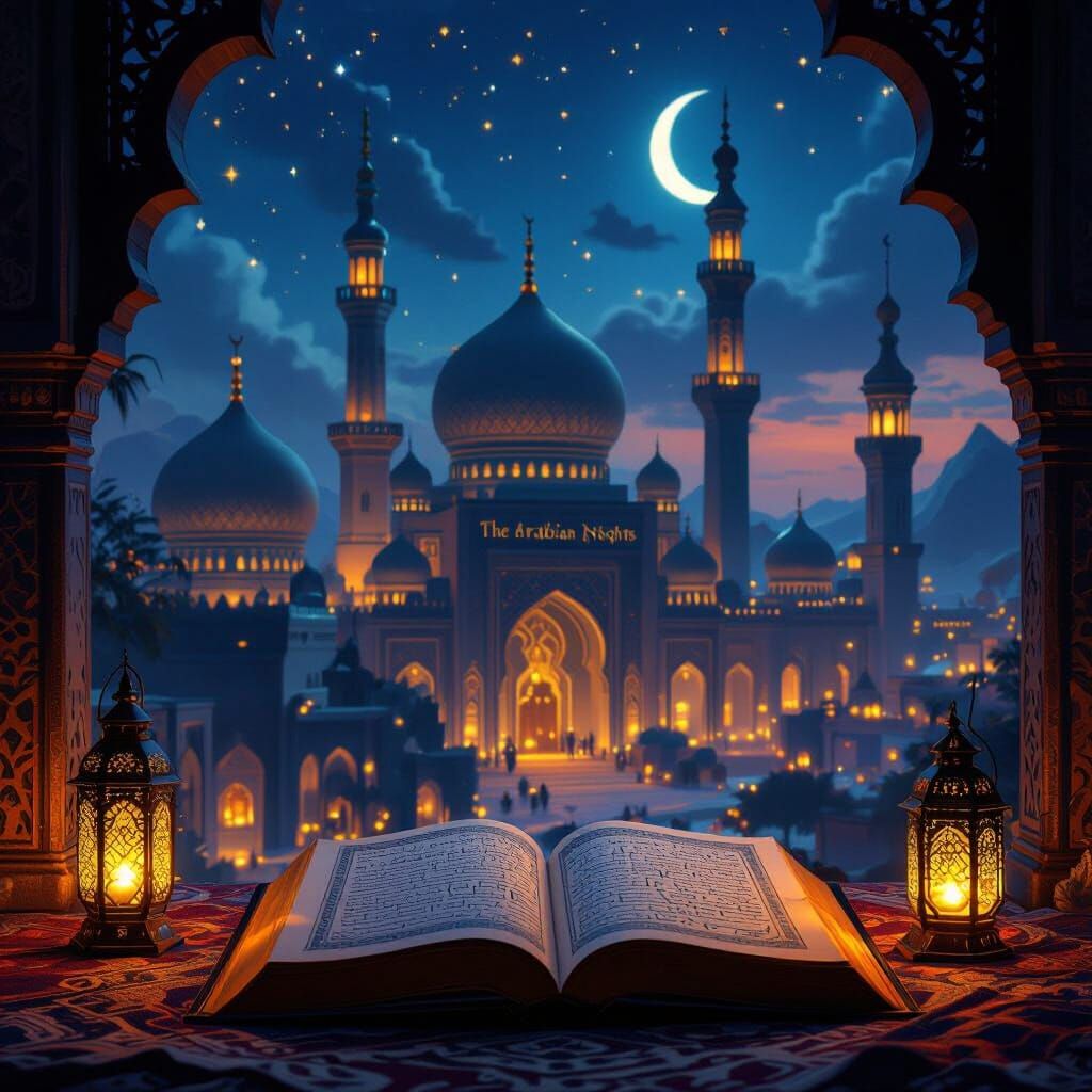 A captivating image of an Arabian night scene featuring classic Islamic architecture. Warm lanterns illuminate intricate patterns, creating a magical atmosphere in this detailed matte painting.