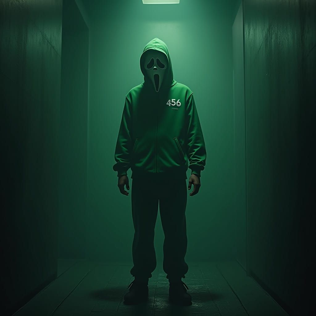 A haunting fantasy concept art piece of a lone figure in a dimly lit, eerie environment, wearing the iconic green tracksuit from Squid Game and the Ghostface mask from Scream, evoking a sense of unease and foreboding.