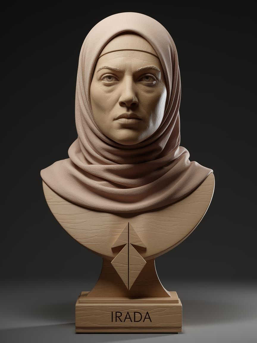 This hyper-detailed 3D render depicts a dignified Palestinian woman, Irada, embodying iron will. Strong frontal lighting emphasizes her determined gaze and resolute posture, symbolizing forward purpose.