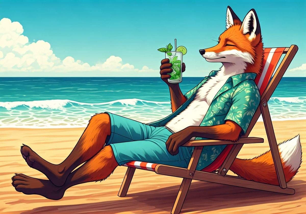 This image shows an anthropomorphic fox in a Hawaiian shirt relaxing with a Mojito. The funny drawing is in manga style and depicts the fox lying in a deck chair.