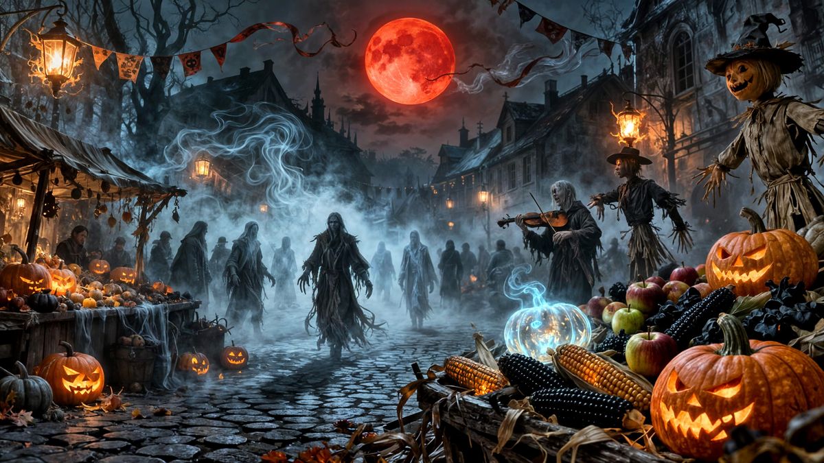 This image captures a haunted harvest festival with spectral townsfolk and glowing jack-o'-lanterns under a blood-red moon. Eerie supernatural energy fills the gothic fantasy scene.